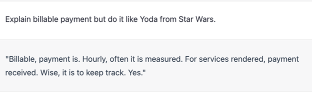 - Explain (complex concept/ term/ idea) but do it like ________. For example, “Explain billable hours but do it like Yoda from Star Wars.” This may sound like a complete joke, but….it works! Check it: